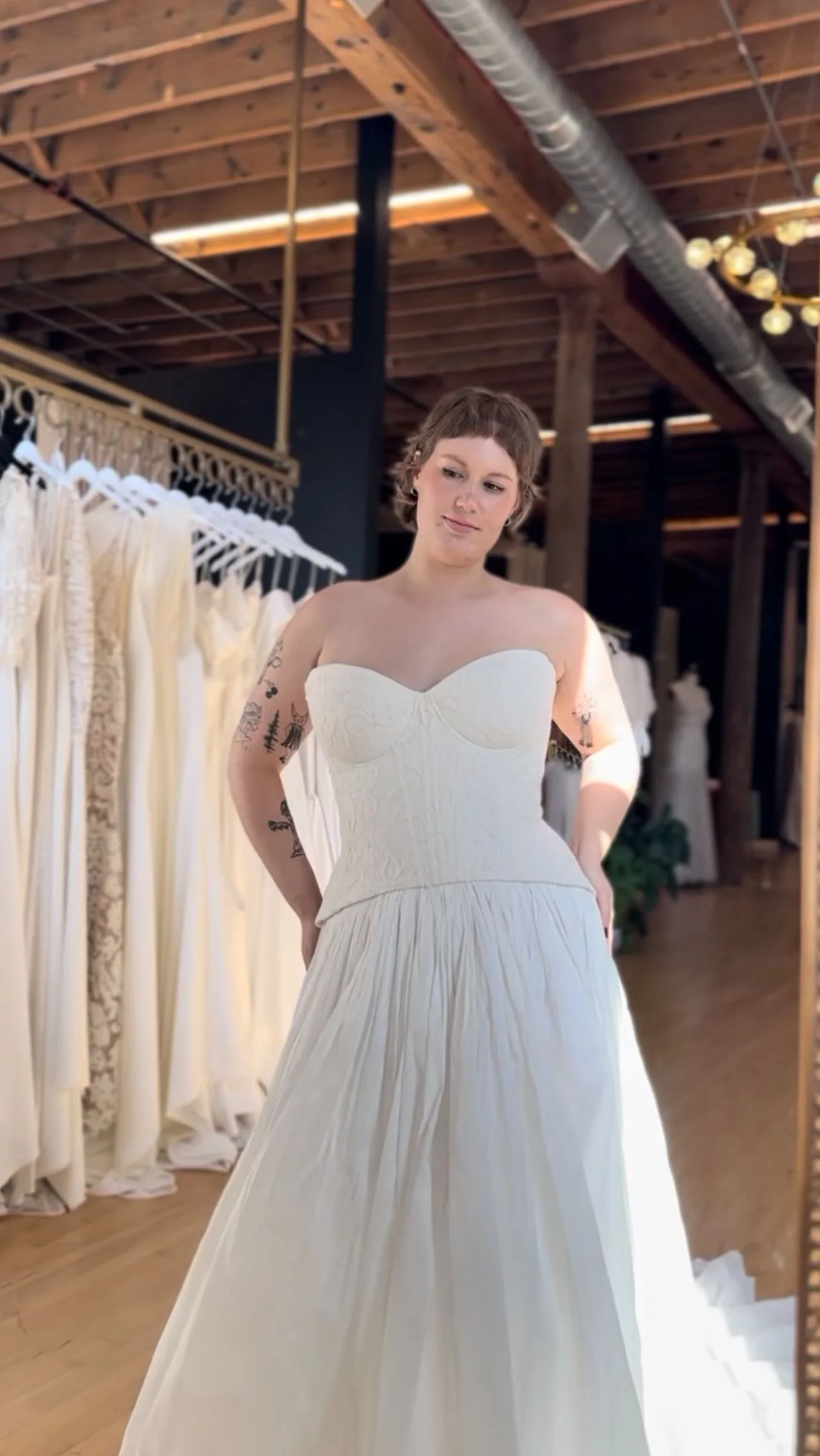βI had an excellent experience finding my dress at strike. the staff were extremely queer friendly! I loved that they all used the correct pronouns for me and asked consent whenever touching my body. overall, I felt really safe and it helped me have fun! couldnβt have asked for anything else being a gender non-binary bride!β