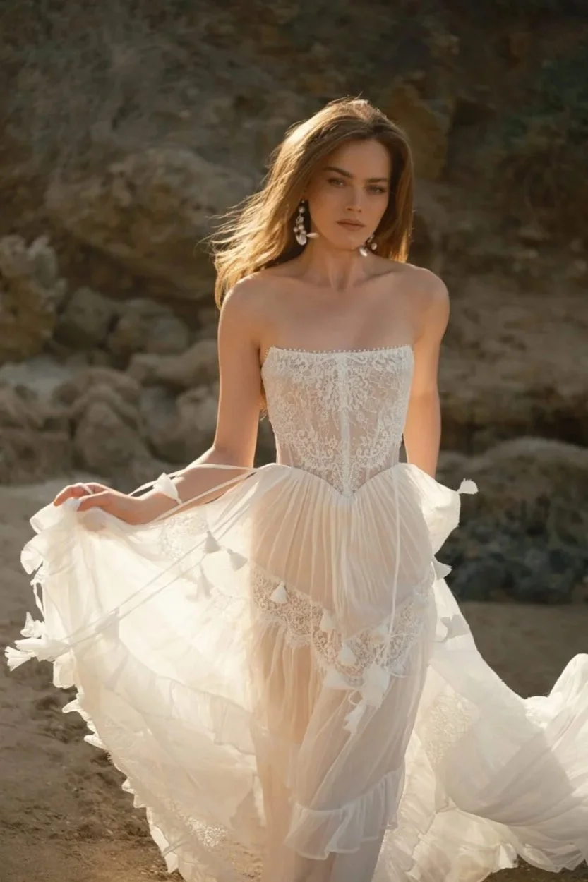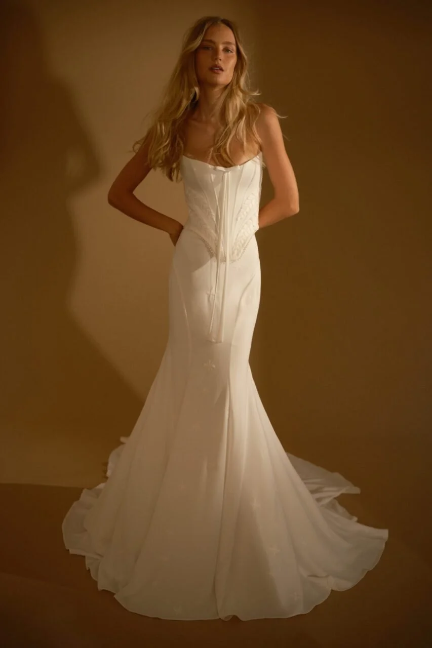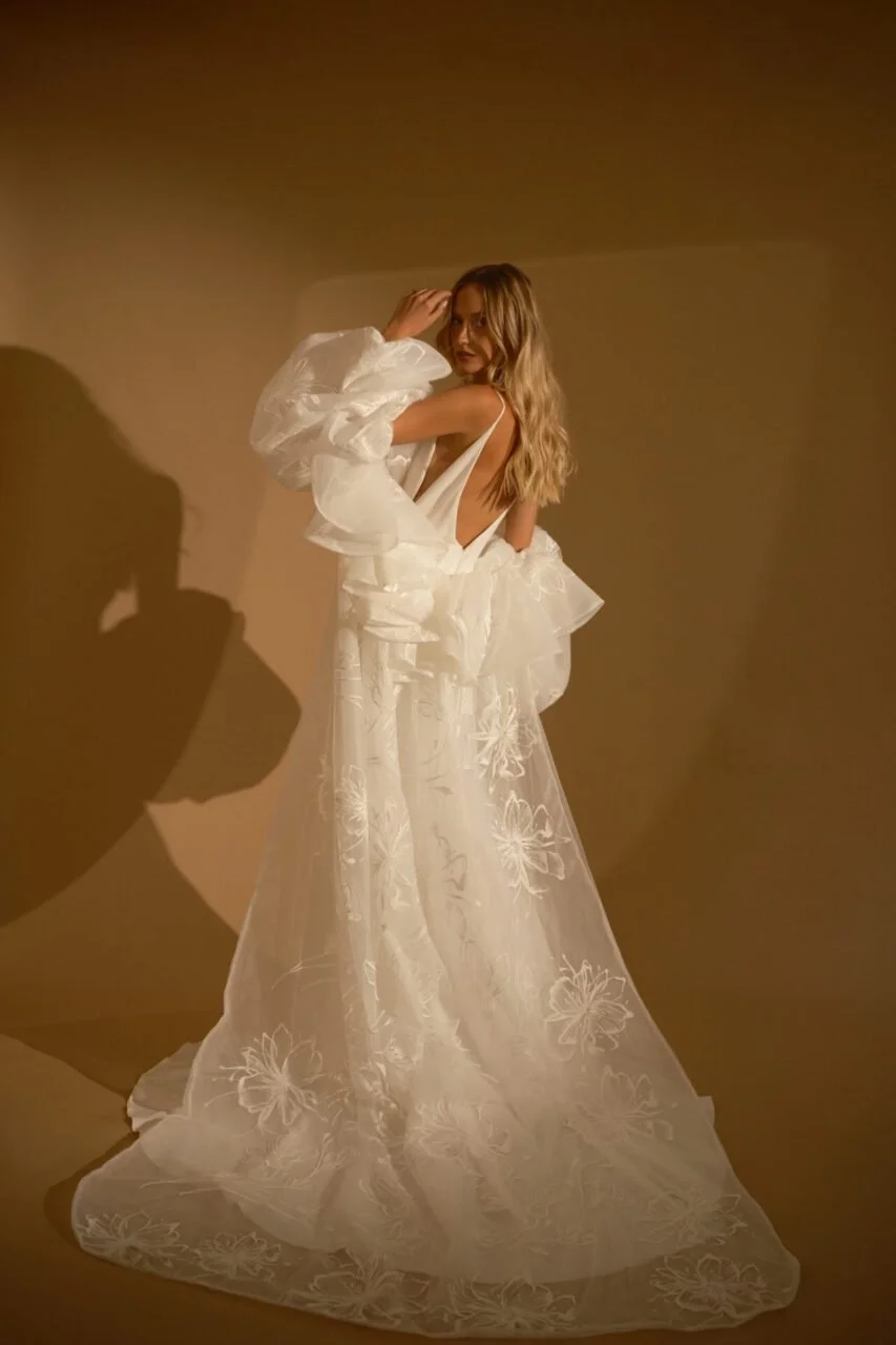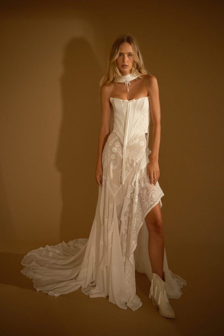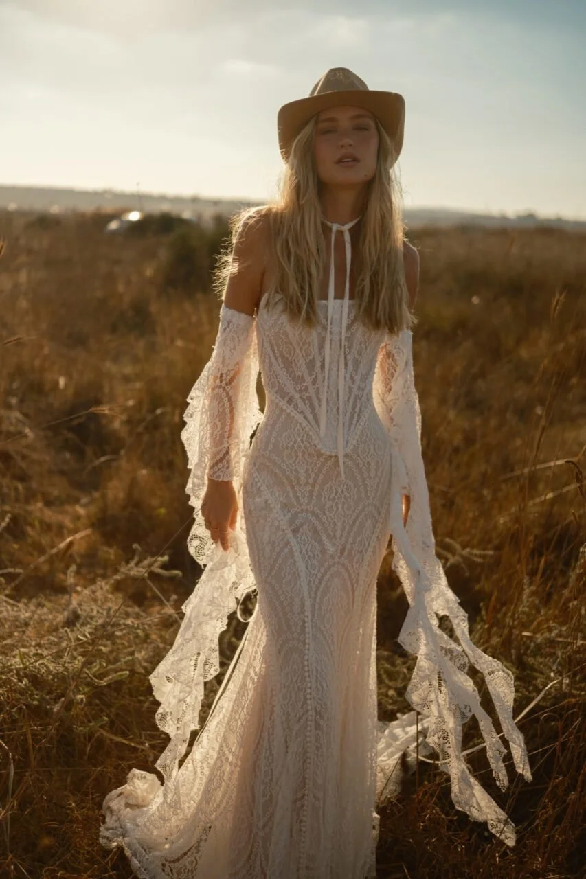 designed for the adventurous bride, rish wedding gowns are crafted using the finest materials and advanced sewing techniques. many styles feature detachable toppers or sleeves, offering two looks in one and making them perfect for brides seeking a unique, fashion-forward boho-glam wedding dress.
