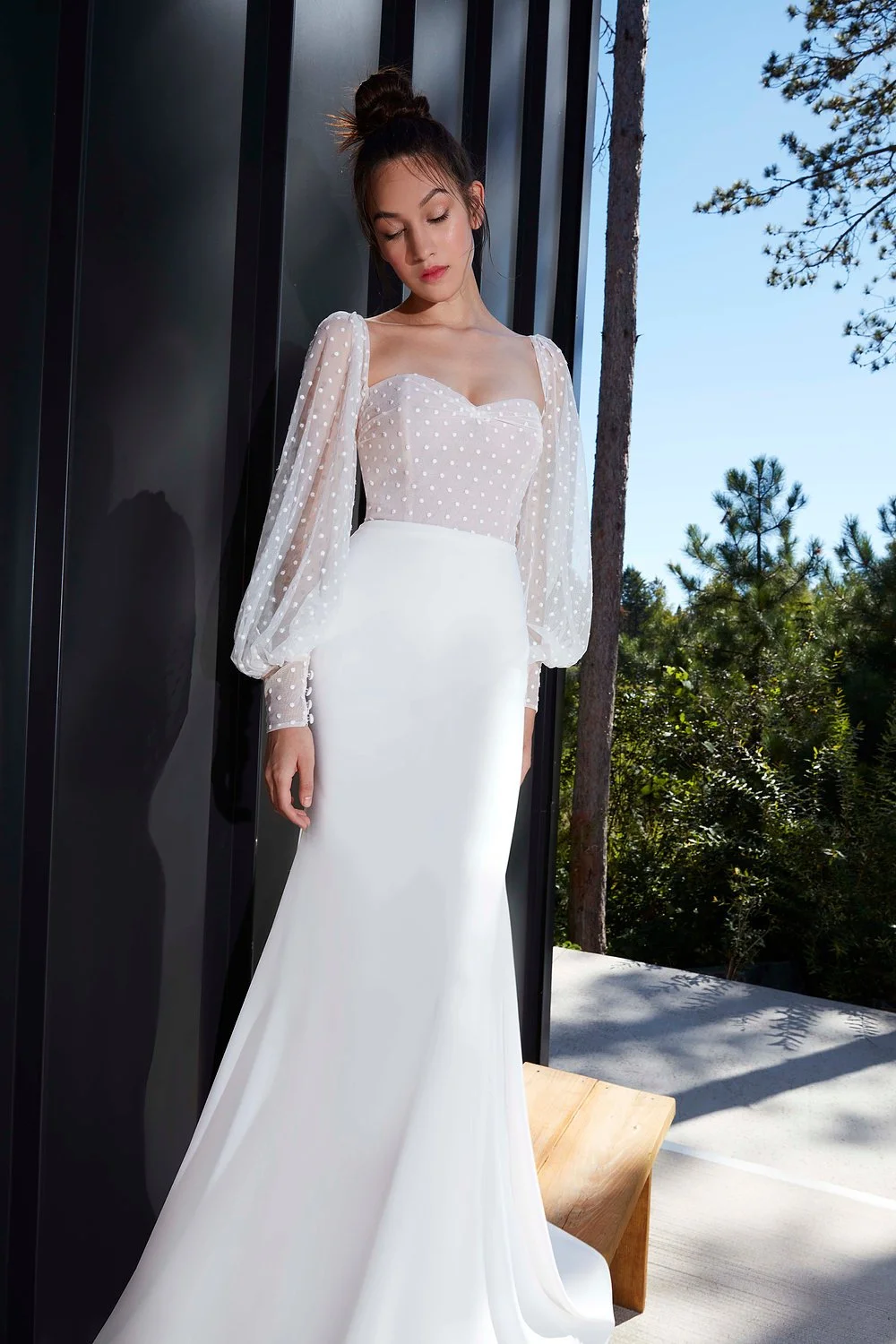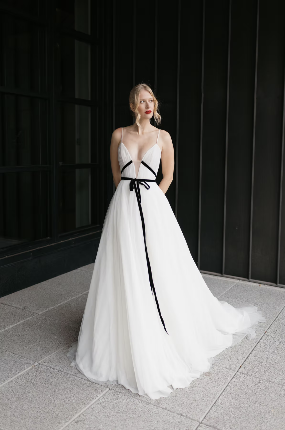 tara latour wedding gowns are designed for modern brides who want something fashion-forward without sacrificing timeless appeal. known for contemporary fabrics, clean silhouettes, pops of color, and romantic details, each gown strikes the perfect balance between soft drama and effortless wearability, revealing just enough while still feeling elevated and refined.
