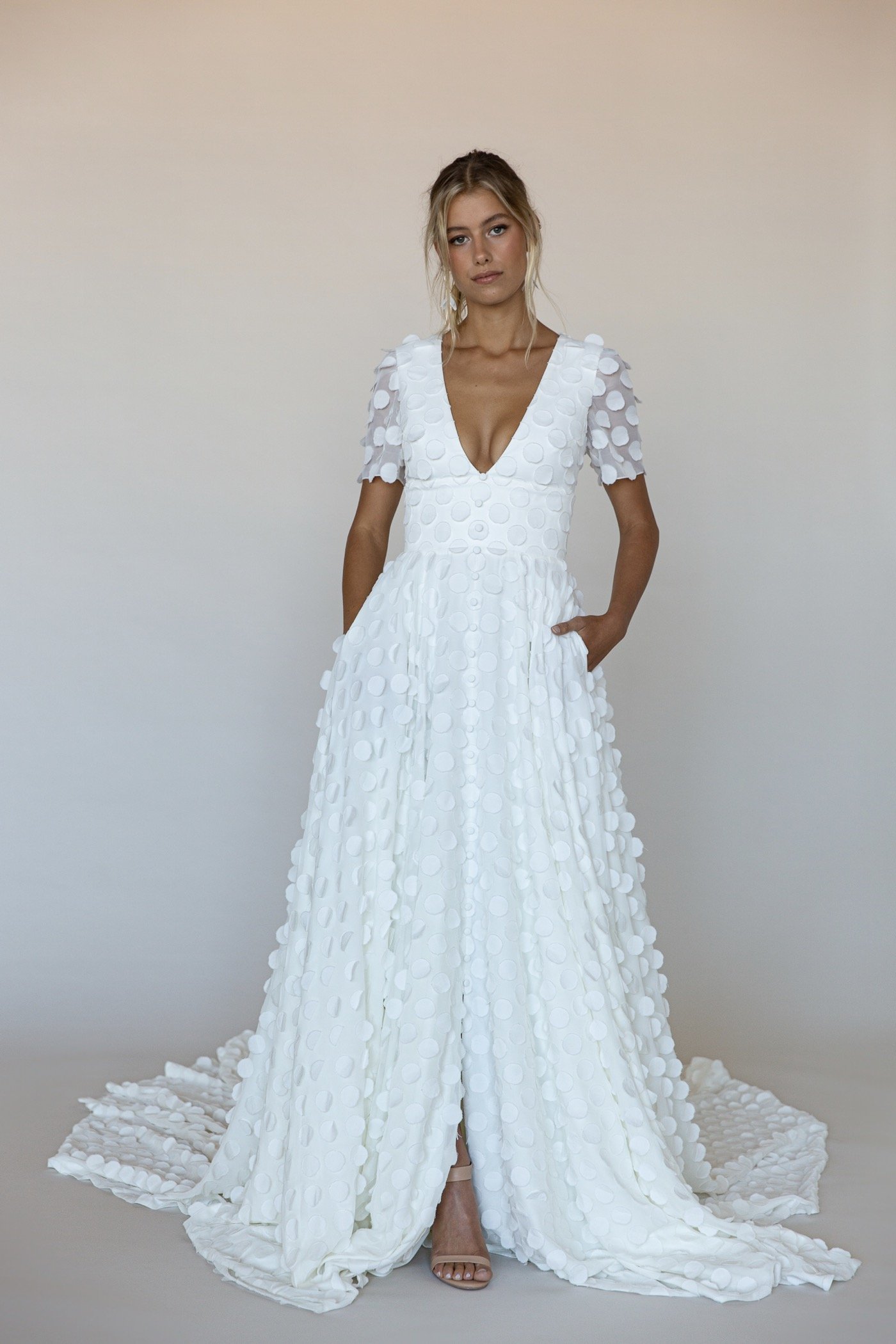 the vagabond bridal collection ranges from clean, minimalist gowns to romantic lace styles and bold, fashion-forward statement dresses. each wedding dress is handmade, one at a time, ensuring exceptional quality and thoughtful attention to detail for brides seeking something truly unique.